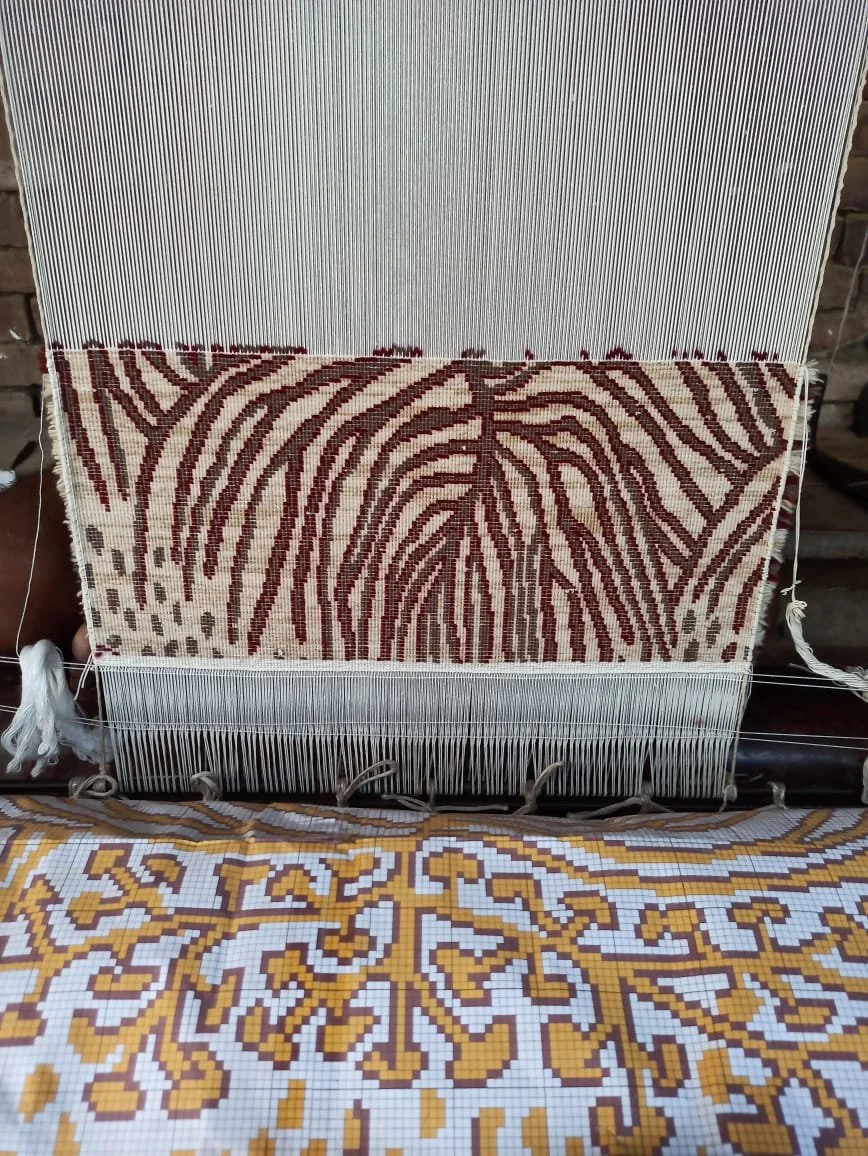 After sourcing the finest quality wool and silk, the raw fibres are cleaned and sorted. Carding is where the fibres are straightened and teased into individual strands by hand ready for spinning. The carded fibres are then spun into yarn using a spinning wheel. Then, the Dye Master prepares the dyes to the right colour and the yarn is dyed by hand using traditional methods. The dyed yarn is allowed to dry naturally in the sun as it gives the yarn a special lustre and nuance to the colour. Once the yarns have dried, they’re wound into balls ready for the looms.